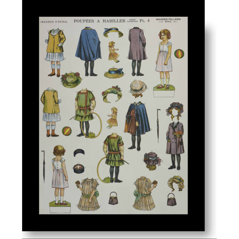 Superbe tirage d'art reprenant une planche de poupées à habiller du 19ème siècle des archives de l'Imagerie d'Epinal.